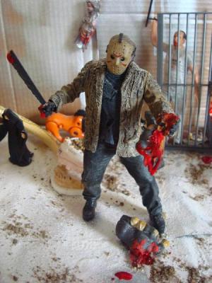 Y otro de los míticos asesinos que no podian faltar aquí... Es Jason, si, si, el de Viernes 13. Aquí le vemos arrancandole la cabeza de un espadazo al podre burrito que debia estar dando calor y leche al recién nacido Jesusito... pobre...