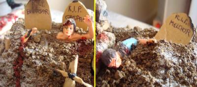 ¡Mírales, pero estos son zombies, que pintan aquí los muertos vivientes en un belén! ¿Eh, veis lo que yo veo? Hay tres tumbas, hay tres zombies... en las lápidas ponen Melchor, Gaspar y Baltasar, ¡no puede ser, son ellos tres, los tres reyes magos han salido de sus lápidas y se quieren adueñar del mundo!